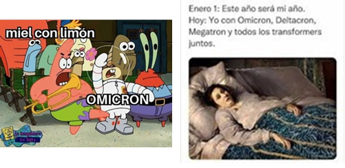 Si el 2020 inició con el SARS-CoV-2, transcurridos dos años, al principio del año 2022, se está en pleno Ómicron: la historia parece repetirse. A veces con un humor algo difícil de analizar ante la contradicción entre el texto escrito y el icónico. Y que tal vez responda a memes que ya no pretenden hacer reír, solo expresar y descargar temor, fatiga, estrés y cansancio (Martin, 2007), es crónica social, sobrecarga exhausta de afectividad.