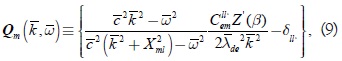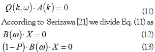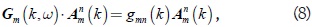 where gmn(k) are the eigenvalues, Amn(k) the corresponding eigenvectors and the matrix Gm(k,ω) is defined in terms of the auxiliar matrix Qm(k,ω)–gmn(k)1. Thus, for each k it is neccessary to find the eigenfrequencies ωmn(k) that satisfy the Eq. (8). The elements of the matrix Qm(k,ω) are given by