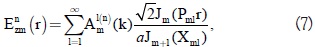 where Aml(n)(k) are the expansion coefficients which define the electric field structure for the transverse magnetic mode TMmn with the indices m,n being the azimutal and radial number respectively. Jm(X) are the Bessel functions of first specie and order m, and Pml is the radial wavenumber which is obtained from the boundary condition Jm(Pmla) = 0 (perfect conductor at the cylinder walls [19]), thus Pmla = Xml and Xml are the zeros of the equation Jm(X) = 0. Introducing the above expansion in the Eqs. (1-5) and considering harmonic propagating fields with angular frequency ω and axial wavenumber