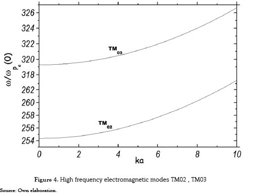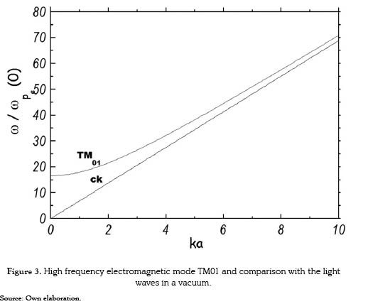 With the knowledge of the macroscopic response, the electromagnetic boundary conditions and under an assumption of the electromagnetic fields structure is possible obtain an eigenvalue problem for the system. The solution of this problem gives the natural frequencies (eigenvalues) with the corresponding wavenumbers of the electromagnetic waves (eigenvectors or eigenmodes) propagating in the system. From the behavior of the eigenfrequencies as a function of the wavenumber (dispersion relation) is possible to calculate important quantities such as the phase and group electromagnetic wave velocities. These quantities allow to calculate the speed of the electromagnetic energy propagation through the system [3]. In addition from the dispersion relation is possible obtain relevant information of the plasma such as the temperature and the density.