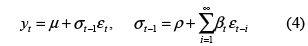 • Modelo no lineal de medias móviles con respuesta con largo alcance [17]: se obtiene al permitir un número infinito de rezagos, es decir, q → ∞: