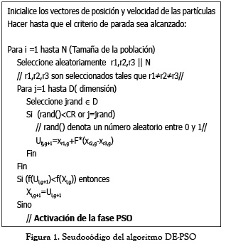 En esta investigación se estiman los parámetros del modelo NLMA empleando el algoritmo híbrido DE-PSO [20] que combina los algoritmos de Evolución Diferencial y Optimización de Enjambre de Partículas. El pseudocódigo del algoritmo híbrido se muestra en la figura 1.