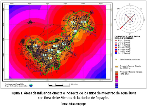 Hay que considerar algunos factores que pueden contribuir a la acidificación de la lluvia en la ciudad de Popayán. El primero de ellos es la ubicación del océano Pacífico y de los volcanes activos, Puracé y Sotará, integrantes de la cadena volcánica de los Coconucos (localizada al SE de Popayán). El océano Pacífico se encuentra ubicado aproximadamente a 80 km de Popayán, el volcán Puracé a 30 km en dirección SE y el volcán Sotará a 35 km en dirección SE. El segundo factor de importancia es el comportamiento de los vientos predominantes. La rosa de los vientos para Popayán (figura 1) señala que los vientos predominantes llevan una dirección SW y W, advirtiendo que los precursores de los compuestos ácidos contenidos en el agua lluvia de la ciudad de Popayán proceden principalmente del océano Pacífico donde se generan iones SO4–2, Cl–, Na+, K+, Mg+2, NH4+ y Ca+2, entre otros, los exudados producidos por la selva del Pacífico [15] y los compuestos azufrados y clorados que emanan de la cadena volcánica de los Coconucos.