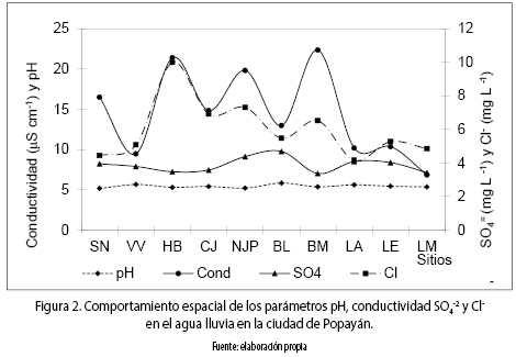 Las muestras de agua lluvia se colectaron entre 20 a 25 días desde septiembre de 2011 a febrero de 2012. Las muestras de lluvia no fueron preservadas in situ. Durante la recolección de las muestras, los recipientes de muestreo fueron rotulados con código, fecha y hora de recolección, y se transportaron congeladas en una nevera de icopor hasta el Laboratorio del Grupo de Estudios Ambientales donde se almacenaron en la nevera a una temperatura de 4 °C para los respectivos análisis. La determinación de pH se realizó empleando un pH Meter, marca Metrhom, modelo 744; la conductividad se determinó mediante un conductímetro marca METROM, modelo 660; la concentración de SO4–2 se determinó mediante la técnica de fosfato monocálcico, empleando un espectrómetro marca Spectronic, modelo Génesis 20, y la determinación de Cl– se efectuó por el método argentométrico, de acuerdo con protocolos reportados en la literatura [12] en los laboratorios de Agroquímica y del Grupo de Estudios Ambientales de la Universidad del Cauca.