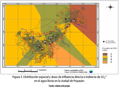 El valor máximo de SO4–2 fue de 7.32 mg L–1, reportado en la estación BL, el mínimo de 1.07 mg L–1, en la estación LM (tabla 3). La media total de SO4–2en la ciudad fue de 3,87 mgL–1, cuyo valor se ubicó entre la media de los sitios VV (3,79 mg L–1) y SN (3,95 mgL–1). En la figura 5 se presenta el comportamiento espacial de SO4–2 en el agua lluvia en la ciudad de Popayán.