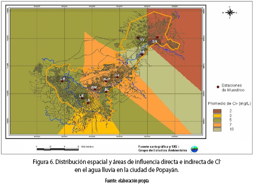 El máximo valor de Cl– durante todo el período de muestreo fue de 24.16 mgL–1, reportado en el sitio BM y el mínimo de 1.15 mg mgL–1, en NJP. La media total fue 6,12 mg mgL–1, cuyo valor estuvo entre los sitios BL (5.48 mgL–1) y BM (6.52 mgL–1) (tabla 3). La distribución espacial de Cl– en el agua lluvia en la ciudad de Popayán se indica en la figura 6.