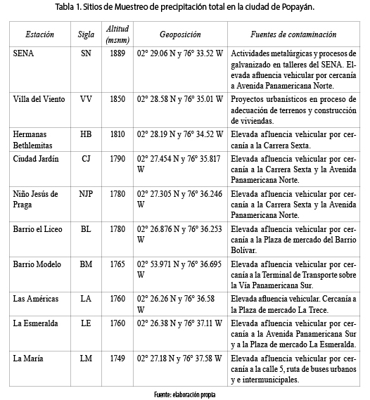 Se ubicaron 10 sitios de muestreo de la precipitación total en la ciudad de Popayán (tabla 1). Su ubicación se realizó teniendo en cuenta la densidad poblacional, las actividades industriales, el tránsito vehicular, las zonas de sensibilidad poblacional, actividad comercial y de servicios, patrimonio histórico–cultural, la seguridad de los implementos y la accesibilidad a los mismos. Se escogió determinar el ion SO4–2 en el agua de lluvia, con el fin de establecer el nivel de incidencia de las emisiones de azufre provenientes de la cadena volcánica de los Coconucos, de gran proximidad a la ciudad de Popayán, y la incidencia de las emisiones debidas al gran parque automotor de esta ciudad. El ion Cl– fue escogido al considerar la posible incidencia de la cercanía del océano Pacífico a la ciudad de Popayán.