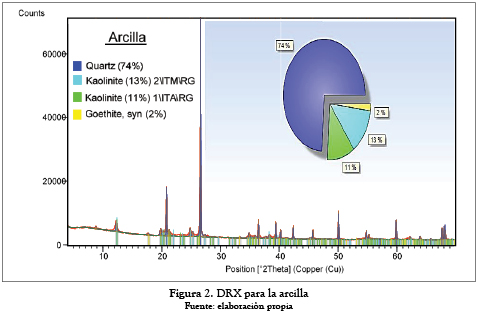 En la figura 2 se observa que la muestra de arcilla corresponde a un material con alto contenido de cuarzo y de mineral de caolinita, lo que la hace un material arcilloso apto para la fabricación de piezas cerámicas tradicionales y materiales de construcción entre medianas y altas especificaciones (ladrillos, tejas, mampostería, entre otros) [10].