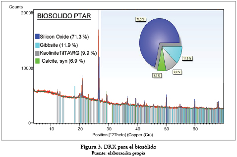 La figura 3 deja ver un contenido (≈ 20 %) entre las fases mineralógicas gibsita y calcita de la muestra biosólido, que lo hace un material apto para utilizarse como cementante para el sector de la construcción. La presencia de caolinita en un 9,9 %, aunque no sea el mineral más representativo en el biosólido, sugiere posibilidades de aplicación en ladrillos cerámicos, ya que favorece la sinterización al ser activado térmicamente.