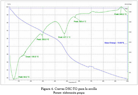 En las figuras 4 y 5 se ven los termogramas para las muestras de las materias primas, donde se observan los picos o cambios térmicos que ocurrieron en su interior. En este análisis térmico se puede ver un primer pico endotérmico a los 58,2 °C, el cual puede estar relacionado con la eliminación del agua libre de la arcilla. El punto de inflexión u onset a 139 °C puede estar asociado con una pequeña transformación del cuarzo libre presente en la muestra. El pico endotérmico a 293 °C corresponde a la transformación o transición de la fase goetita a la fase hematita. El pico endotérmico a 565,4 °C y el exotérmico a 948,3 °C corresponden a transformaciones de la caolinita, aunque el pico de 565,4 °C está muy cercano al de la transformación de cuarzo α a cuarzo β (573 °C teórico). Estos valores pueden estar ligeramente o por encima o por debajo de los teóricos, debido a que estos pueden estar reportados para la fase mineralógica pura y no para una mezcla de ellas.