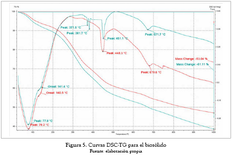 Para comprobar la homogeneidad de la muestra de biosólido se realizaron dos ensayos de análisis térmico simultáneo de la misma, en los que se detectaron varios picos. Un pico endotérmico a los 78 °C está relacionado con la eliminación de agua libre en las muestras. Un punto de inflexión u onset a los 140 °C puede estar asociado con una pequeña transformación del cuarzo libre presente en las muestras. El doble pico, a 371,6 °C y 381,7 °C, puede deberse a algún tipo de contaminante de origen polimérico mezclado y no detectado en la muestra. El pico endotérmico alrededor de los 450 °C podría estar asociado a una transición del mineral de carbonato de calcio de la muestra. Estos valores pueden estar ligeramente o por encima o por debajo de los teóricos, debido a que estos pueden estar reportados para la fase mineralógica pura y no para una mezcla de ellas.
