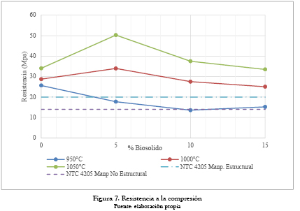Resistencia a la compresión: las dos variables manipuladas en la investigación tienen influencia directa en la resistencia a la compresión. Con la temperatura existe una relación directamente proporcional y con % de biosólido inversamente proporcional. Según la NTC 4205, unidades de mampostería no estructural deben cumplir con resistencias mínimas a la compresión de 14 MPa y unidades de mampostería estructural de 20 MPa. Todos los elementos cerámicos elaborados con las diferentes combinaciones de temperatura y biosólido cumplen con el requisito mínimo de resistencia a la compresión para ser clasificados como mampostería no estructural. Los elementos cocidos a 1000 °C y 1050 °C con los diferentes porcentajes de biosólido (0 % - 5 % - 10 % -15 %) cumplen con los requerimientos de la norma para ser clasificados como mampostería estructural.
