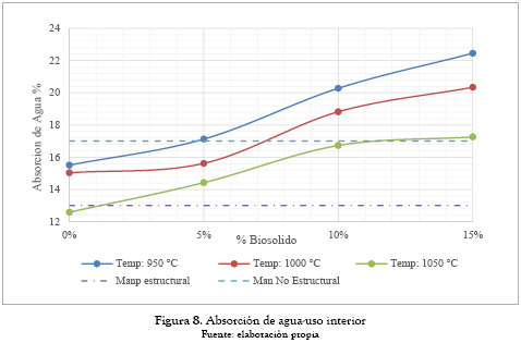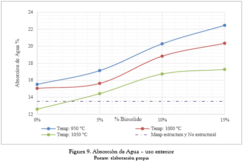 La NTC 4205 establece los requisitos que deben cumplir las unidades de mampostería para uso interior y exterior así: mampostería estructural (13 %) y mampostería no estructural (17 %). Con base en los resultados obtenidos pueden ser usados como mampostería no estructural en interiores los elementos cerámicos que fueron elaborados con un 5 % de adición de biosólido en cualquiera de las tres temperaturas de cocción, así como elementos cocidos a 1050 °C con hasta el 15 % de biosólido. Respecto al uso en exteriores, en la figura 9 se puede ver que ningún elemento de los elaborados cumple con los valores exigidos en la norma.