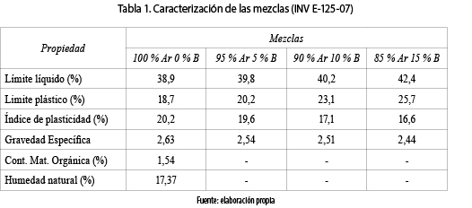 Los valores de límite líquido, límite plástico e índice de plasticidad (límites de Atterberg) se muestran en la tabla 1. Los resultados demuestran que las mezclas se clasifican como arcillas inorgánicas de media plasticidad y que un incremento en la proporción de biosólido hace que la mezcla tienda a clasificarse como un suelo orgánico de baja plasticidad. El incremento de porcentaje de biosólido se traduce en una disminución de plasticidad (índice de plasticidad), comportamiento que permite clasificar al biosólido como un material con propiedades desgrasantes; materiales cuyo fin es disminuir la plasticidad excesiva en las arcillas. [10]