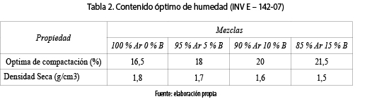 Los datos que se muestran en la tabla 2 corresponden al resultado del ensayo para la determinación de la humedad óptima de compactación. De su análisis es posible concluir que la densidad disminuye con el aumento del porcentaje del biosólido; comportamiento que se atribuye a la menor densidad que tienen las partículas de biosólido en comparación con las de arcilla, lo que se confirma con los datos de gravedad específica mostrados en la tabla 1.