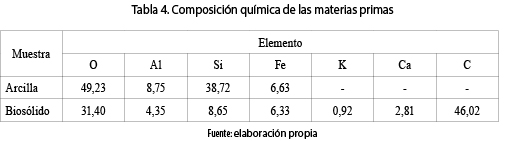 Los resultados de la composición química elemental (% en peso) de las materias primas (arcilla, biosólido) se pueden ver en la tabla 4.