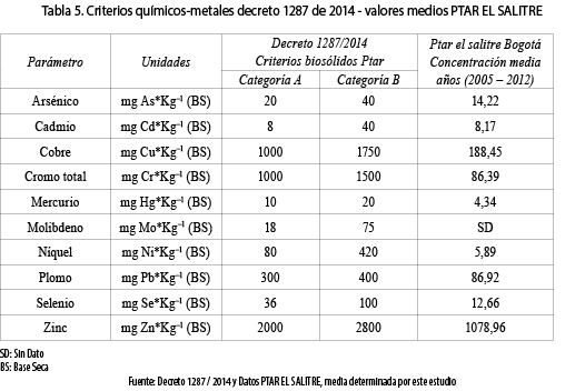 El Ministerio de Vivienda, Ciudad y Territorio expidió el Decreto 1287 de 2014, en el cual se establecen criterios (químicos y microbiológicos) para el aprovechamiento de los biosólidos generados en PTAR municipales. En la tabla 5 se presentan dos categorías de clasificación según contenido de metales pesados (Decreto 1287/14) y los valores medios obtenidos entre los años 2005 a 2012 para metales pesados en muestreos realizados periódicamente por la PTAR El Salitre. Los biosólidos de la PTAR El Salitre se clasifican en la categoría B; lo anterior debido al valor encontrado en el cadmio (8,12 mg*1–1), el cual supera los límites establecidos para categorizarlo en A. Para los patógenos no se hizo comparación, debido a que se realizan procesos de digestión y deshidratación al lodo, con el fin de estabilizarlo, adquiriendo características de biosólido. Adicionalmente, para el aprovechamiento del material en la fabricación de ladrillos, se le realiza un proceso de cocción a una temperatura mayor a los 900 ° C, lo que garantiza la inactivación de estos microorganismos.