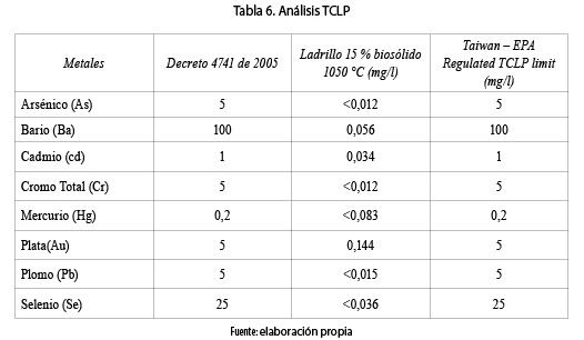 Para estimar la inocuidad de los metales pesados se hizo el ensayo de prueba de lixiviación en el Laboratorio Integrado de Ingeniería Civil y Ambiental de la Universidad de los Andes, para determinar la característica de toxicidad (TCLP) a un elemento elaborado con 15 % de biosólido a una temperatura de 1050 °C. Como se puede ver en la tabla 6, las concentraciones de metales lixiviados son mucho menores que los límites establecidos en el Decreto 4741 de 2005 [14], en el cual se establece como residuo peligroso o desecho tóxico aquel que: "al realizársele una prueba de lixiviación (TCLP), contiene una concentración superior a los niveles máximos permisibles en el lixiviado". Lo anterior implica que el ladrillo con 15 % de biosólido no se considera un material tóxico, y puede ser empleado como material para mampostería estructural y no estructural, de acuerdo con la norma NTC 4205.