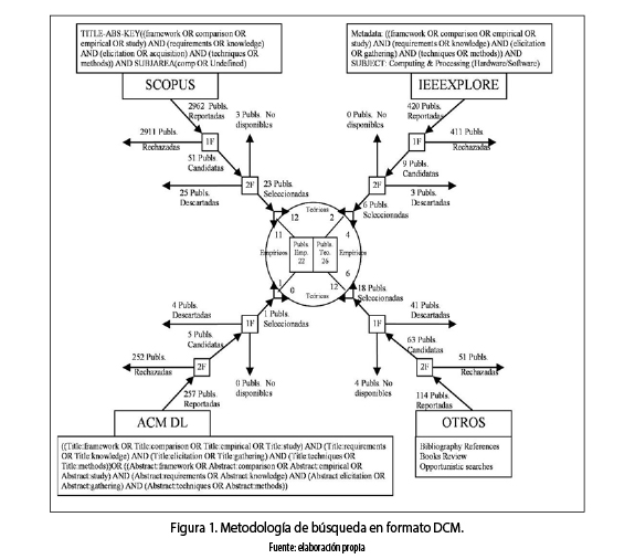 Adicionalmente a esta búsqueda, también se realizó una búsqueda no sistemática considerando las referencias bibliográficas de artículos seleccionados, revisiones de libros relacionados con requisitos y búsquedas oportunistas en Internet. La figura 1 muestra los resultados obtenidos en estas búsquedas en formato DCM. También muestran las cadenas de búsquedas respectivas y los filtros considerados: uno revisando el título y resumen (1F: primer filtro), y otro revisando el artículo completo (2F: segundo filtro).