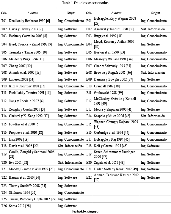 Como se observa en la figura 1, la revisión de Scopus y la revisión no sistemática fueron las más productivas, ya que la gran mayoría de los estudios de interés fueron identificados de esta forma. En Scopus se seleccionaron 23 artículos de un total de 2962. En búsquedas oportunistas, libros y otras bibliografías, se encontraron 18 trabajos de interés de un total aproximado de 165 publicaciones. Las otras búsquedas sistemáticas no arrojaron un número importante de nuevas publicaciones a pesar del gran volumen revisado (6 de 420 en IEEE XPLORE y 1 de 257 en ACM DL). Los estudios seleccionados consideran libros, revistas, conferencias, disertaciones, entre otros. La tabla 1 muestra los 48 estudios seleccionados: 26 son teóricos (código T) y 22 empíricos (código E); 19 provienen de la ingeniería del conocimiento, 24 de la ingeniería de software y 5 de los sistemas de información.