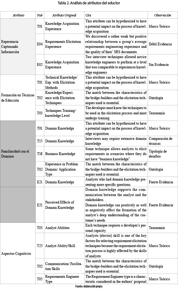 Por otro lado, para los atributos formación en técnicas de educción y aspectos cognitivos, a pesar de ser considerados en varias propuestas teóricas no se hallaron trabajos que los estudiaran empíricamente.