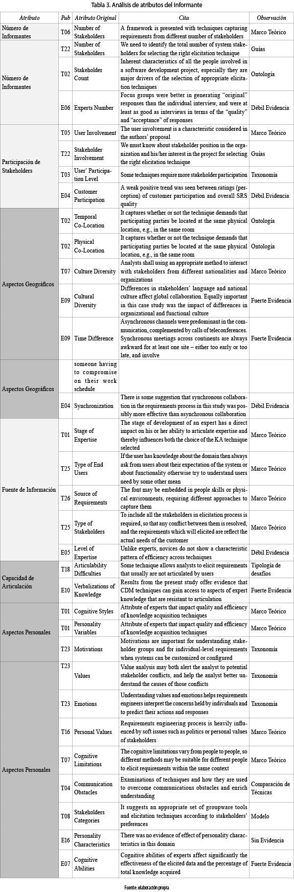 Los 32 atributos encontrados relacionados con el informante se agruparon en 6 atributos genéricos. Como muestra la tabla 3, los atributos número de informantes, participación de stakeholders y fuente de información, que habían sido propuestos por 3 trabajos, solo recibieron una débil ratificación de su influencia en los estudios E06, E04 y E05, respectivamente. En cambio, los atributos aspectos geográficos, capacidad de articulación y aspectos personales que habían sido propuestos en 3, 1 y 9 propuestas respectivamente, recibieron, al menos, una fuerte evidencia empírica de influencia.