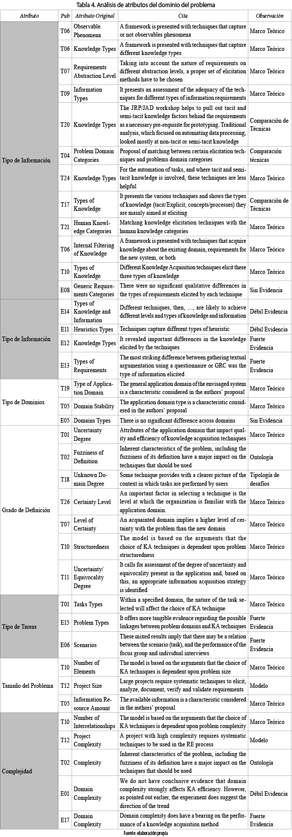 Los 37 atributos encontrados relacionados con el dominio del problema se agruparon en 6 atributos genéricos. Como puede verse en la tabla 4, los atributos, tipo de información, tipo de tareas y complejidad, que habían sido propuestos por varios trabajos teóricos, obtuvieron, al menos, una fuerte evidencia empírica de su influencia. En cambio, el estudio E05 no pudo encontrar evidencia de influencia del atributo tipo de dominios. Por otro lado, para los atributos grado de definición y tamaño del problema, a pesar de ser considerados en varias propuestas teóricas, no se hallaron trabajos que los estudiaran empíricamente.