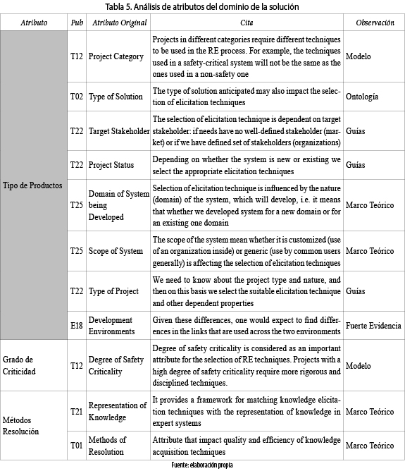 Los 11 atributos encontrados relacionados con el dominio de la solución se agruparon en 3 atributos genéricos. Como se muestra en la tabla 5, el atributo tipo de productos, propuesto por varios estudios teóricos, obtuvo una evidencia fuerte de su influencia en el estudio E18. Por otro lado, para los atributos grado de criticidad y métodos resolución, a pesar de ser considerados en 1 y 2 propuestas teóricas, respectivamente, no se hallaron trabajos que los estudiaran empíricamente.