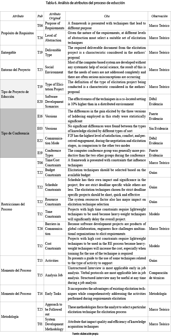 Los 22 atributos relacionados con el proceso de educción se agruparon en 8 atributos genéricos. Como puede verse en la tabla 6, el atributo tipo de proyecto de educción que había sido propuesto por T09 obtuvo una débil ratificación de influencia en el estudio E20. En cambio, para los atributos propósito de los requisitos, entregable, entorno del proyecto, restricciones del proceso, momento del proceso y metodologías, a pesar de ser considerados en varias propuestas teóricas no se hallaron trabajos que los estudiaran empíricamente. Un caso especial es el del atributo tipo de conferencia que, no habiendo sido considerado en ninguna propuesta teórica, fue utilizado en cuatro estudios empíricos hallándose fuerte evidencia de su influencia.