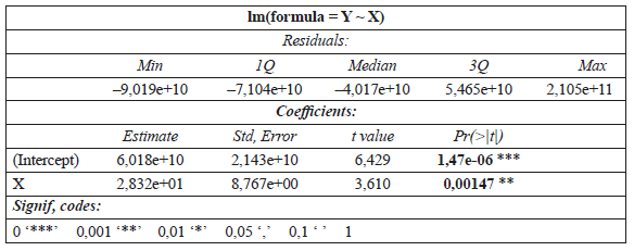 Los coeficientes de la regresión se muestran en la tabla 6, donde tanto el intercepto como el coeficiente β1, es decir, el coeficiente de la variable inversión, son significativos al tener un valor p < 0,05 bajo la distribución T-student. Con base en esta información se puede inferir que la relación existente entre las variables estudiadas es estadísticamente significativa.