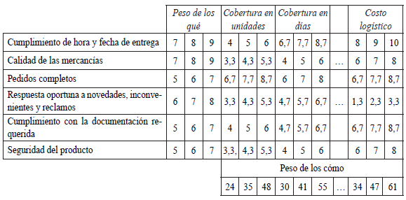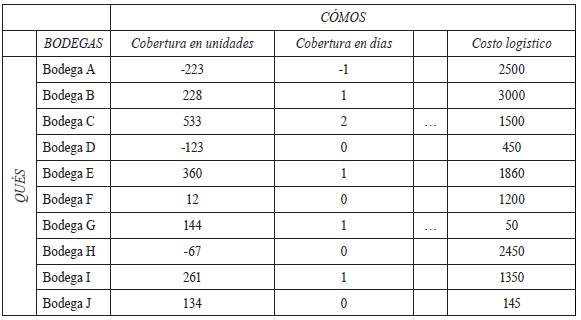 Se ingresa el valor numérico de cada cómo para cada una de las bodegas que se muestra en la tabla 5. En este paso, las variables externas (los cómo) se califican de manera cuantitativa obteniéndose los valores por medio de fórmulas matemáticas, asociados a los criterios presentados en el paso de la identificación de los cómo o variables externas y cuyas expresiones matemáticas se encuentran en [16].