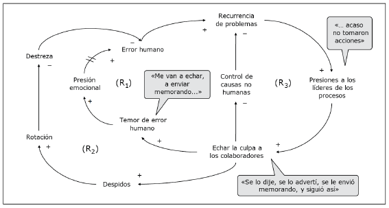 Cuando se cae en la costumbre de echar la culpa durante el análisis-solución de problemas, la aparente causa raíz es la persona en la que recayó la manifestación del problema. Si esto es repetitivo, probablemente se opte por despedirla. Ahí termina el supuesto mejoramiento del sistema, en una variable dicotómica: con la persona, sin la persona, no más. El confort que deviene con el síndrome de “echar la culpa” es producido por el desconocimiento del mismo y por los círculos viciosos que este genera, algunos de los cuales se muestran en la figura 1 (véase más estructuras en [17]).