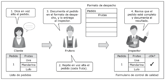 Los materiales para el primer escenario son: dos lapiceros (uno para el frutero y otro para el inspector), un reporte de pedidos (cliente), un formato de despacho (frutero) y un formato de control de calidad (inspector). En [17] puede profundizarse al respecto.