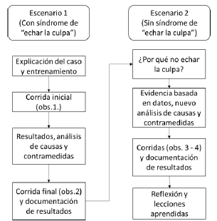 Se simula dos escenarios de labor. El primero, llamado escenario con el síndrome de “echar la culpa”, busca culpables durante la identificación de las posibles causas de pedidos defectuosos. En cambio, el segundo (sin presencia del síndrome) se enfoca en factores latentes que den lugar al aprendizaje del sistema.