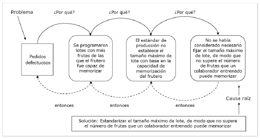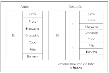 Véase, en la figura 5, de izquierda a derecha, los cuestionamientos (¿por qué?) hasta llegar a la hipótesis de causa raíz del problema. Así mismo, de derecha a izquierda (parte inferior), nótese la coherencia entre causa - efecto, por medio del conector “entonces”. Bajo esta óptica, como no se había considerado necesario fijar el tamaño máximo de lote con base en la cantidad de frutas que un frutero típico (entrenado y motivado) tiende a memorizar, entonces no existe tal estándar de producción. Por tanto, al no existir, al frutero se le hacen pedidos con más frutas de las que este suele recordar. En consecuencia, tiende a fallar en pedidos de 5 o más frutas. Nótese que la hipótesis es que la causa de los pedidos defectuosos se debe al diseño del estándar de producción y no a la persona. La solución propuesta es prácticamente la misma redacción que la causa, anteponiendo una acción; en este caso, estandarizar. En ese sentido, para intervenir dicha causa se dividió en dos partes (a y b) los pedidos con más de cuatro frutas, lo que lleva a estandarizar el tamaño máximo de lote, según la figura 6.