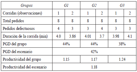 Las ideas de posibles razones de pedidos defectuosos, encontradas en el primer escenario, giraron en torno a: frutero desconcentrado, poco comprometido, no capacitado, desmotivado, distracción desde los demás compañeros, ruido en el ambiente, y dificultad para retener tantas frutas (se mencionó en uno de los grupos). Los tres grupos aportaron, en su mayoría, ideas centradas en causas humanas, por lo que la contramedida fue cambiar el frutero o expresarle que “ponga más cuidado”. En la tabla 1 se presentan los resultados (PGD y productividad).