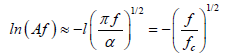 Donde l es el espesor de la muestra y f c =(α /π l 2 ) es la llamada frecuencia de corte, que es aquella para la cual la longitud de penetración térmica es igual a l. De esta manera, la pendiente de la gráfica del logaritmo natural de A multiplicado por f, como función de f ½, permite el cálculo directo de la difusividad térmica. La conductividad térmica (k) y la efusividad térmica (ε) de las muestras se calcularon con las relaciones descritas en las ecuaciones (2) y (3) [31]: