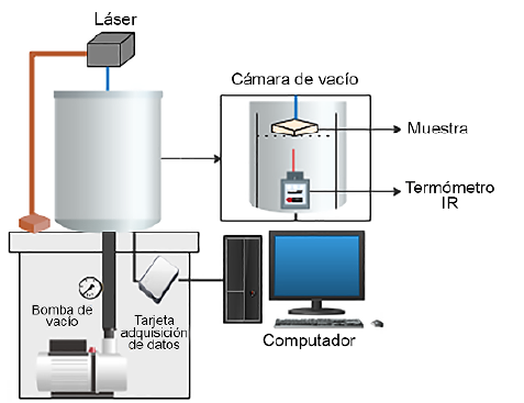 La determinación del C p del nanocompuesto de TiO2 en matriz de poliuretano, con diferentes concentraciones de NPs-TiO2 se hizo con el método de relajación térmica. El montaje del sistema de medición se muestra en la figura 2; en este se dispone de una cámara cilíndrica sellada, de acero inoxidable de 40 cm de alto y 25 cm de diámetro; dentro del cilindro se suspende la muestra con dimensiones aproximadamente de 10 mm de ancho, 10 mm de largo y 0.6 mm de espesor. La superficie frontal de ésta se radió con un haz de luz de longitud de onda de 450 nm, procedente de un láser de estado sólido alimentado con una fuente de 4.7 V y 140 mA. El gradiente de temperatura entre la superficie frontal y la trasera de la muestra se midió utilizando un termómetro infrarrojo Lutron Modelo 908.