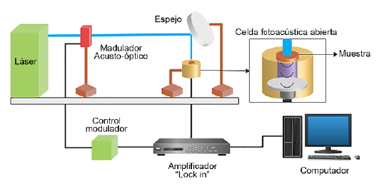 El sistema de medición de difusividad térmica con la técnica FA se basa en la producción de ondas acústicas por calentamiento periódico del material debido a procesos de desexcitación no radiativos. La parte frontal de la muestra se calienta periódicamente por iluminación pulsada y el calor se propaga a través de ella; de tal forma que en la superficie posterior de la muestra el cambio de temperatura en una capa adyacente de aire produce sonido de muy baja intensidad. La variación periódica de presión que se genera es detectada por un micrófono en una configuración de celda abierta. Esta señal se amplifica y filtra, teniendo en cuenta la frecuencia de modulación de la luz incidente como referencia [23].