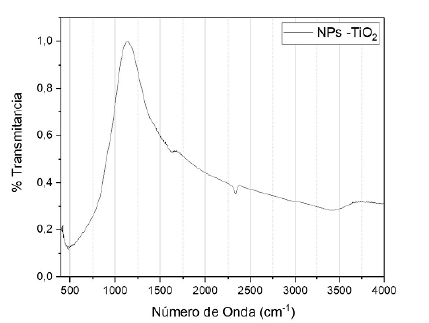 En la figura 4 se muestra el espectro FTIR de las muestras de dióxido de titanio nanoparticulado. Se observa un pico en 3414 cm-1 representativo del estiramiento del enlace O-H, relacionado con el subproducto de Ti(OH)4 y con la presencia de humedad proveniente del ambiente [33]. El pico en 1631.7 cm-1 es generado por el estiramiento del enlace Ti-O y la banda entre 800 cm-1 y 450 cm-1 representa el estiramiento del enlace Ti-O-Ti; esto refleja la formación de las NPs-TiO2 [27] [34].