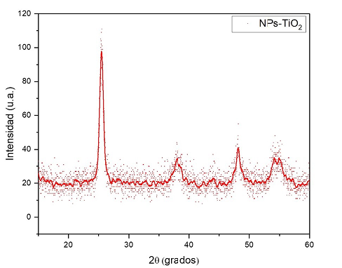 En la figura 5 se observa el difractograma de la muestra, con picos en 25°, 38°, 48°, 54° y 55°, característicos de la fase anatasa del dioxido de titanio. El tamaño de las NPs-TiO2, alrededor de 5.4±0.1 nm, fue determinado usando la ecuación de Scherrer (4), con base en información del pico de mayor intensidad en el difractograma [35].