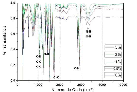 En la figura 6 se muestran los espectros FTIR que se obtuvieron con el uso de un accesorio ATR; las muestras corresponden a los compositos en la matriz de poliuretano con diferentes concentraciones porcentuales en masa de NPs-TiO2. A lo largo del barrido, se observa la disminución de la transmitancia a medida que aumenta la cantidad de NPs-TiO2. No se observan modificaciones en los picos representativos del grupo uretano que permitan inferir un cambio químico en la matriz del poliuretano por la adición de las NPs-TiO2 [36].