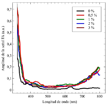 Aunque se observan diferencias en las curvas espectrales, no es posible afirmar que se deban al cambio de la concentración de las NPs-TiO2, ya que las mediciones no corresponden exactamente a la absorbencia, sino que son proporcionales a esta. Esto se debe a la naturaleza de la técnica, en la que el sellado de la celda es un factor que afecta la intensidad de la señal FA. Sin embargo, es muy claro el cambio en el espectro cuando se agregan la Nps-TiO2, sobre todo en la región del infrarrojo cercano.