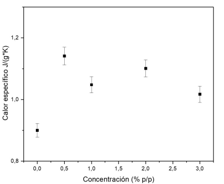 En la figura 8 se muestra el C p de los nanocompuestos en matriz de poliuretano en función de la concentración de masa de las NPs-TiO2. Aunque la adición de éstas aumentó el C p de la matriz del poliuretano, el incremento de la concentración a su vez hizo que el C p del nanocompuesto disminuyera; sin embargo, estos valores están dentro del intervalo reportado para NPs-TiO2, entre 1 y 1.1 J/g K [36]. Esto sugiere, que con un contenido cada vez mayor de NPs, la distribución del tiempo de relajación se amplía, lo que puede ser atribuido a que cada una de ellas interactúa con la interface del material polimérico que la recubre; los procesos químicos o físicos que tienen lugar en estas regiones tienen un papel fundamental en el almacenamiento de energía térmica [39].