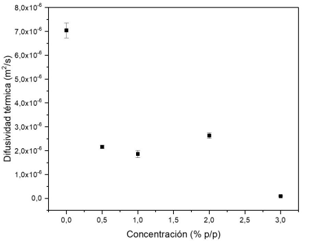 Figura 9 Difusividad térmica de los nanocompuestos en matriz de poliuretano con diferentes concentraciones de NPs-TiO2.
