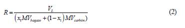 En este estudio también se evaluó un parámetro que determina el comportamiento del proceso de desvolatilización conocido como factor R, el cual se define como la relación entre el porcentaje en peso de los volátiles liberados (VL) y el contenido de materia volátil presente en la mezcla bagazo-carbón, ambos en base seca libre de cenizas. El factor R se calcula por la ecuación (2):