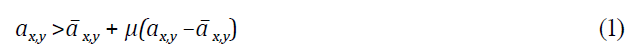 Where μ is the arithmetic mean of the pixels in the direction of index y. Groupings that contain few pixels and belong to the first and last rows are rejected.