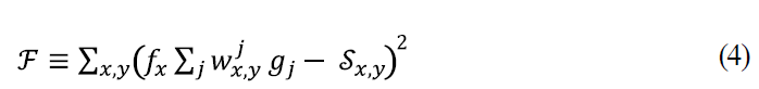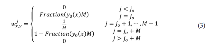 Where w j x,y is a tensor that represents the weights and are non-zero for indices j that fall within a pixel of x,y sensor. Since g divides the pixel into a size grid M then w j x,y will be defined by equation (3):
