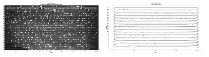 The spectral profile was based on an image of ThAr's lamp. This algorithm varies the parameters like peak, extraction, and degree of the polynomial. We started by varying the extraction's width, finding that with a value equal to 20, it can detect emissions in more detail. As for peak width, it was decided to leave it at 1 since, with that value, more details were seen in the emissions. The value of the polynomial was left at 3, and when it varied to 5, no change was noticed. In Fig. 10, the spectral profile is superimposed on a rectified THAr lamp image. For the extraction of a spectrum of stars, the routine depends on the number of iterations, so as the iterations were increased, calculation time increased. Finally, in the same figure, you can see HD108 star's spectrum extracted in pixels.