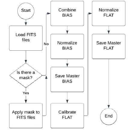 In the context of software development, according to software engineering principles, it is essential to follow an established order that includes stages of Analysis, Design, Development, Quality, and Deployment as indicated [10]. Following this structure, it is essential to highlight that it is necessary to fully understand reduction processes and an algorithm developed by [11] to obtain the best result. Therefore, the first step is to carry out a requirements analysis. This task will be done through interviews with key people from the Alfa Orion research group to carry out business process modeling. Furthermore, this coincides with an architectural vision of a design based on Kruchten's proposal [12]. The 4+1 model with some views allows the identification of a process that will be conducted. To do this, it was decided to model the processes using flow diagrams. This choice facilitates the discretization of the steps required in image processing, covering the needs in astrophysics and software engineering, thus aligning with the analysis stage in software development, as suggested [13].